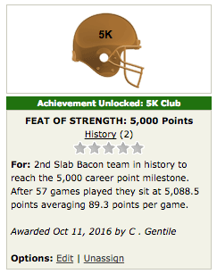 Achievement Unlocked: 5K Club — 2nd Slab Bacon team in history to reach the 5,000 career point milestone. After 57 games played they sit at 5,088.5 points averaging 89.3 points per game. |
