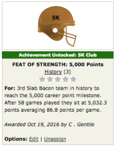 Achievement Unlocked: 5K Club — 3rd Slab Bacon team in history to reach the 5,000 career point milestone. After 58 games played they sit at 5,032.3 points averaging 86.8 points per game. | View Trophy 403 Trophy Case |
